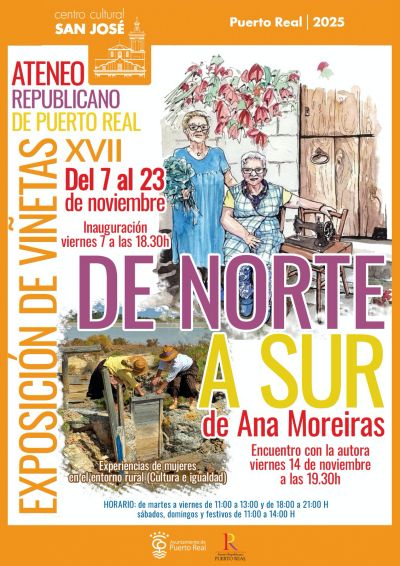 Este viernes 7 de noviembre a las 18:30 horas, el Centro Cultural San José acogerá la inauguración de la exposición «De norte a sur», una muestra de viñetas de la artista gallega, Ana Moreiras, que este mediodía han presentado la concejala de Cultura, Nazaret Ramírez, y la presidenta del Ateneo Republicano de Puerto Real, Elena Romero, entidad organizadora del evento.
