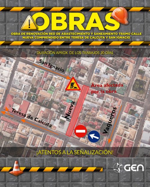 Este miércoles, 19 de noviembre, van a dar comienzo las obras de renovación de la red de abastecimiento y saneamiento en el tramo de la calle Nueva, comprendido entre Teresa de Calcuta y San Ignacio.
