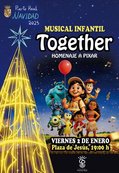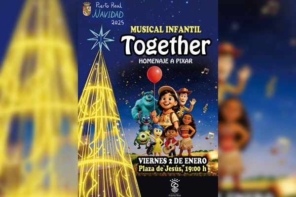 El Ayuntamiento de Puerto Real invita a disfrutar del musical infantil ‘Together. Homenaje a Pixar’, previsto para el viernes 2 de enero a las 19:00 horas en la Plaza de Jesús.