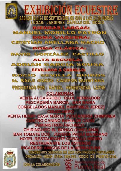 La Hermandad Nuestra Señora del Rocío de Puerto Real organizará el próximo 24 de septiembre en los jardines de su Capilla una Exhibición Ecuestre que contará con la colaboración del Ayuntamiento de la ciudad y varios comercios locales.