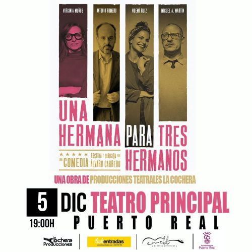 El próximo jueves 5 de diciembre, a las 19:00 horas, el Teatro Principal de Puerto Real será escenario de la divertida comedia “Una hermana para tres hermanos”, una obra escrita y dirigida por Álvaro Carrero y producida por La Cochera Producciones Teatrales.
