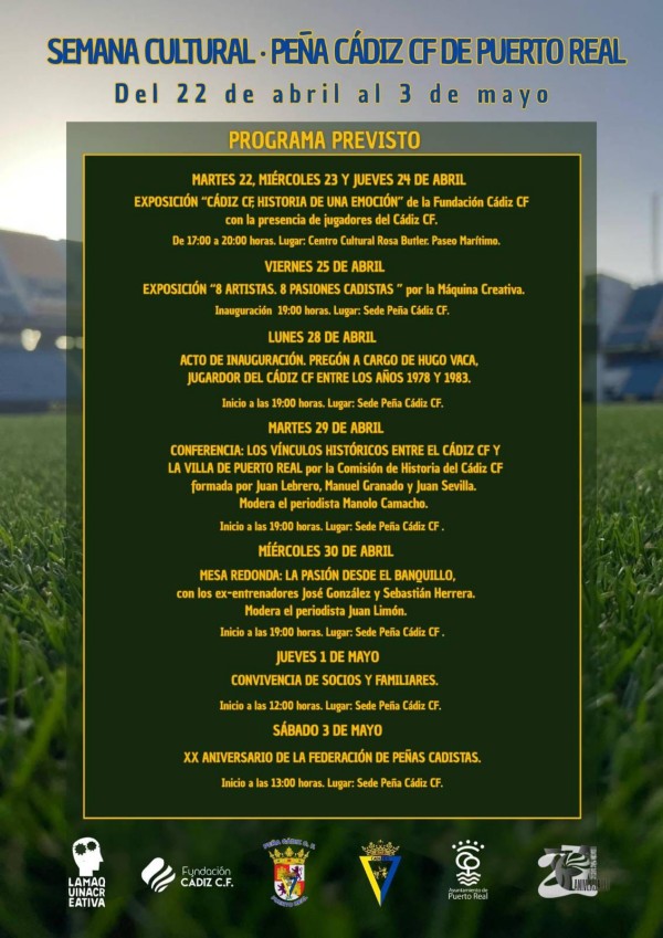 - Martes 29 de abril: Conferencia “Los vínculos históricos entre el Cádiz CF y la Villa de Puerto Real”, por la Comisión de Historia del Cádiz CF formada por Juan Lebrero, Manuel Granado y Juan Sevilla. Modera el periodista Manolo Camacho. A las 19:00 horas en la sede de la peña cadista de Puerto Real.