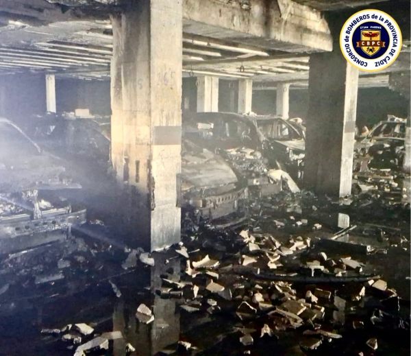 El fuego, que movilizó a dotaciones de los parques de Tres Caminos, Cádiz y Medina, se propagó con gran rapidez en el sótano del edificio, donde ardieron unos 30 coches y varias motos.