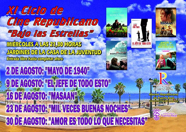 El ciclo de cine republicano «Bajo las estrellas» regresa un verano más a los jardines de la Casa de la Juventud. Se celebrará todos los miércoles del mes de julio a las 22:00 horas y en agosto media hora antes, siendo el acceso gratuito hasta completar aforo.