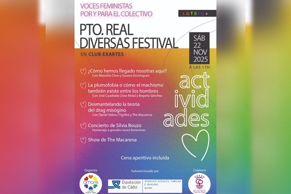La Asociación Amare LGTBI+, con la colaboración del Ayuntamiento de Puerto Real, organiza el Diversas Festival, una jornada dedicada a la reflexión, el feminismo y la cultura inclusiva. El evento se celebrará el sábado 22 de noviembre en el local del Club Social Exartes (C/ San Alejandro, 41) y contará con entrada gratuita.