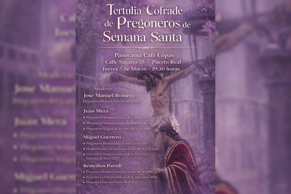 El encuentro estará moderado por José Manuel Romero, Pregonero del Cartel Vera Cruz 2026, y contará con la participación de destacados oradores como Juan Mera, Pregonero de la Semana Santa de Cádiz 2017 y de Jerez 2026; Miguel Guerrero, Pregonero de la Hermandad de Salvación 2026 y Orador Poético al Santísimo Cristo de la Sed 2026; y Remedios Parodi, Pregonera de la Semana Santa de Puerto Real 2016, entre otros reconocimientos en su trayectoria.