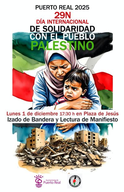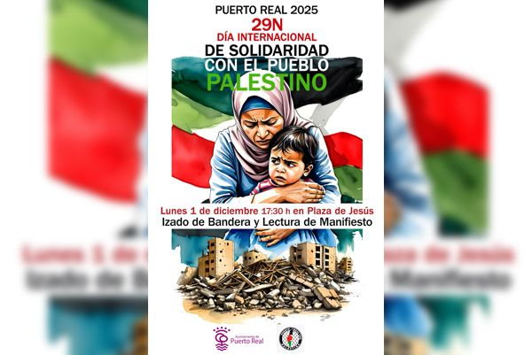 Con motivo del Día Internacional de Solidaridad con el Pueblo Palestino que se conmemora el 29 de noviembre, el Ayuntamiento de Puerto Real celebrará un acto el próximo lunes 1 de diciembre, a las 17:30 horas, en la Plaza de Jesús en colaboración con colectivos solidarios del municipio.